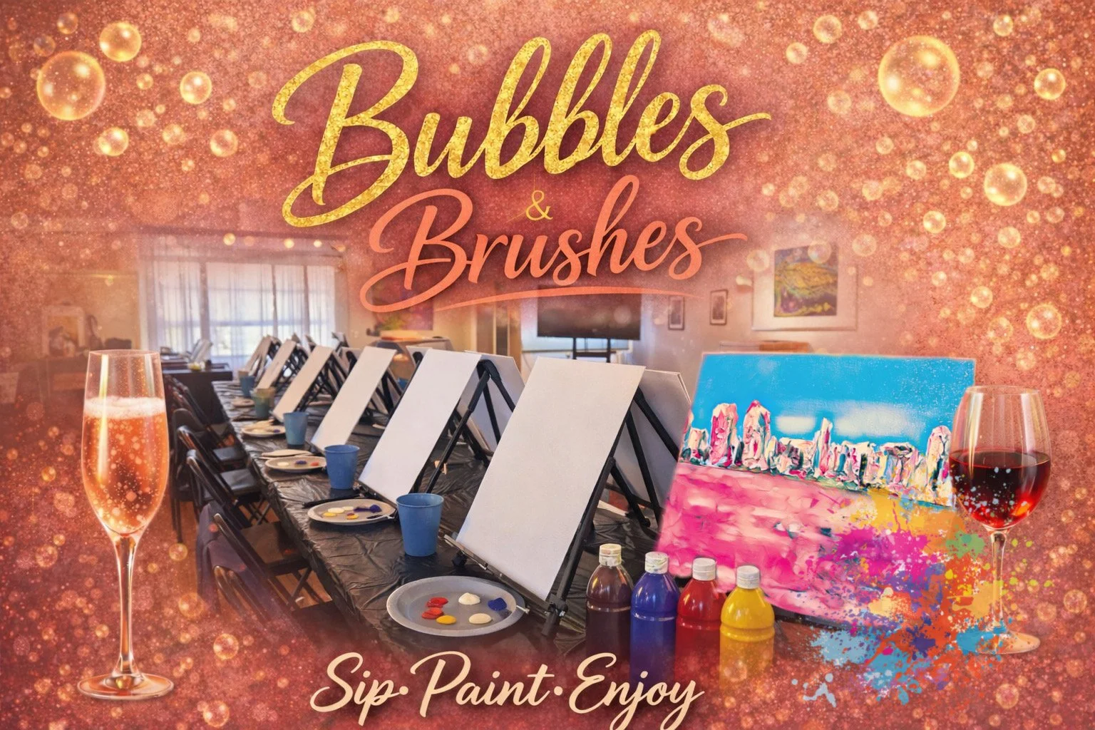 Begin your experience with a glass of wine at the Bubble Bar, then head into the Vineyard Room where your painting supplies are set and ready for you to create!