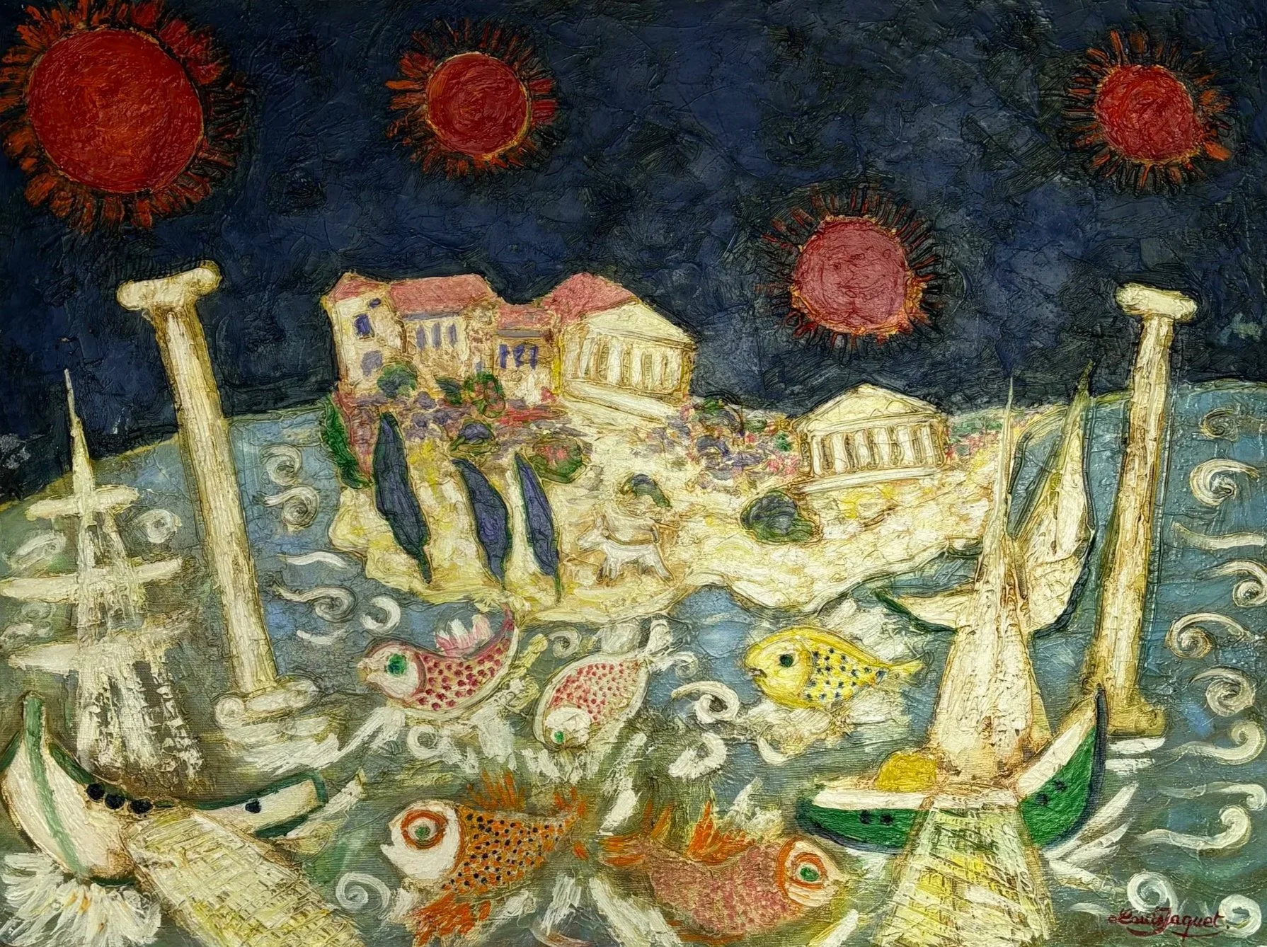 Louis Jaquet continues to travel extensively. He maintains a studio in Italy (where he has exhibited regularly since the 70’s). He also maintains studios in Southern France and Paris. He is listed in the prestigious Benezit, the encyclopedic directory of artists.